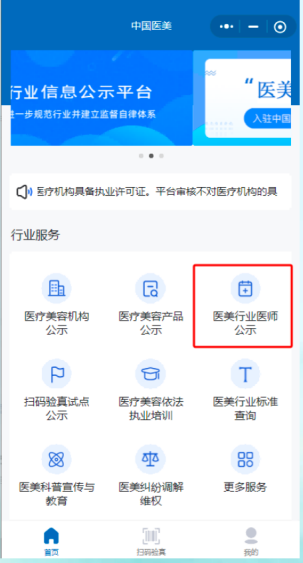 微信扫描指定二维码或在搜索栏中搜索“中国医美”小程序,进入中国医美官方平台。