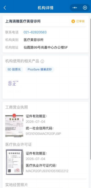 点击“医疗美容机构公示” 选项,进入机构信息查询页面,即可查看该机构是否为蓉芷®品牌合作机构,并可查看该机构的详细资质信息,包括机构类别、地址、证件有效期、统一社会信用代码、医疗执业许可证代码等。