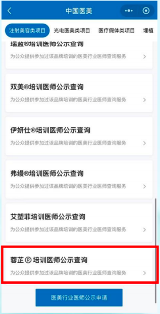 进入“医美行业医师公示”,选择“蓉芷®培训医师公示查询”。