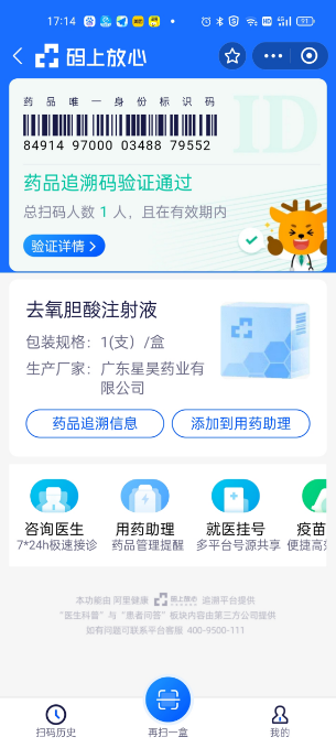 打开支付宝APP——点击顶部“扫一扫”功能——扫描产品包装盒上的二维码或条形码,出现“药品追溯码验证通过,总扫码人数为1人,且在有效期内”则为蓉芷®品牌正规产品。