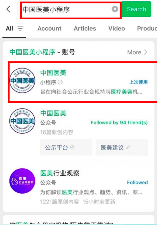 微信扫描指定二维码或搜索“中国医美”小程序。