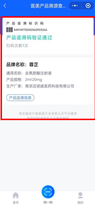 点击“扫码验真”选项,根据系统提示扫描产品包装盒上的二维码或条形码。扫描完成后,若查询结果显示“产品追溯码验证通过”且“扫码次数为X次”,则该产品为蓉芷®品牌正规产品;若出其他结果,则可判定为假货。